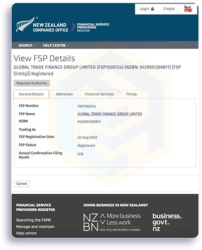 GLOBAL TRADE FINANCE GROUP LIMITED with NZBN number 9429051369811 is authorized and regulated by the New Zealand Financial Service Providers (FSP) with license number FSP1005724.