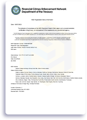 GLOBAL TRADE FINANCE GROUP INC. is registered, authorized and regulated by the United States of America Financial Crimes Enforcement Network Department of the Treasury (FinCEN) with license number 31000249878296.